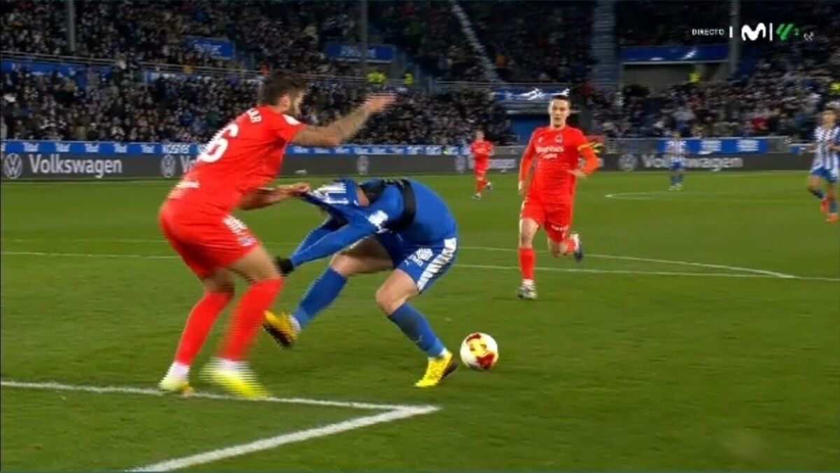O encontro entre Alavés e Real Sociedad, dos quartos-de-final da Taça do Rei, ficou marcado por um inusitado penálti assinalado a favor do conjunto da casa por falta sobre Toni Martínez, antigo avançado do FC Porto. Tudo aconteceu na segunda parte, quando o dianteiro foi levemente agarrado por Caleta-Car dentro da área, ficando nesse movimento com a cara tapada com a sua... camisola. O árbitro analisou as imagens e deu o pontapé de penálti, que Martínez viria a falhar. No final, a Real Sociedad venceu por 3-2, com Gonçalo Guedes a marcar um dos golos.