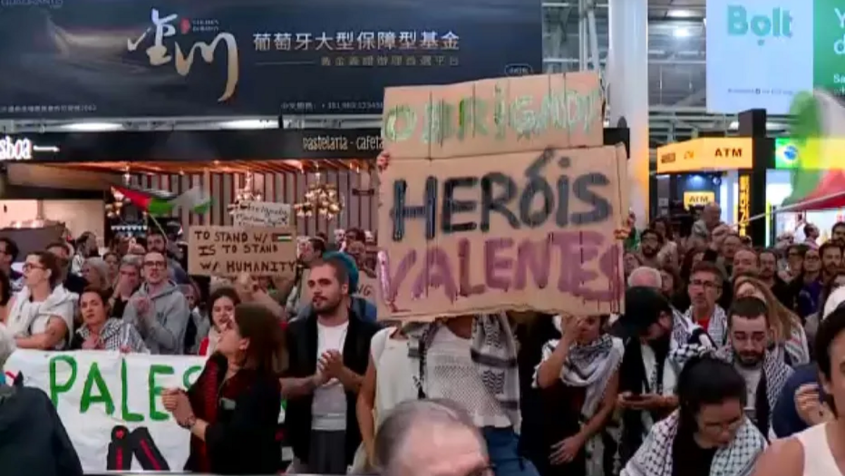 No aeroporto de Lisboa foram recebidos por centenas de pessoas com cartazes onde se pode ler "Bem-vindos, heróis", "heróis valentes" e apelos ao fim do genocídio e da guerra em Gaza.