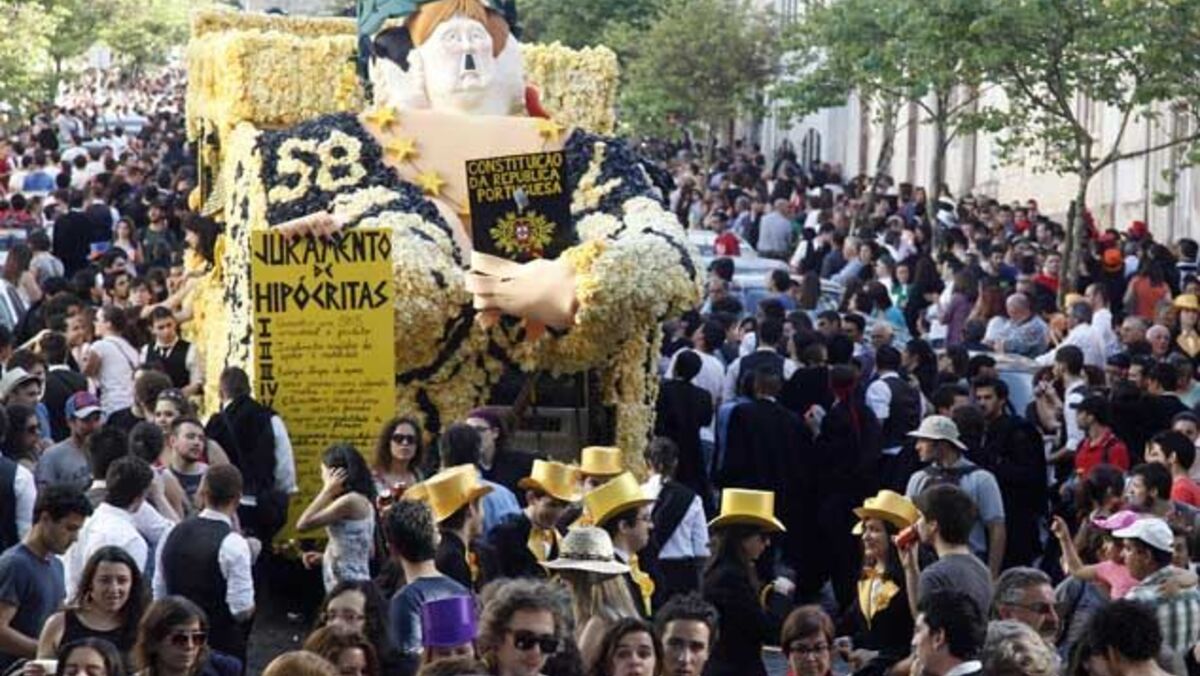Numa tarde em que sol não deu tréguas, a ingestão e os banhos de cerveja foram uma imagem recorrente no desfile universitário, por entre cânticos, beijos, abraços e "bengaladas" nas cartolas dos finalistas. Mais exuberante, um grupo de alunos entreteve-se a subir à estátua do papa João Paulo II, nos Arcos do Jardim, e a atirar-se para os braços de outros colegas.
