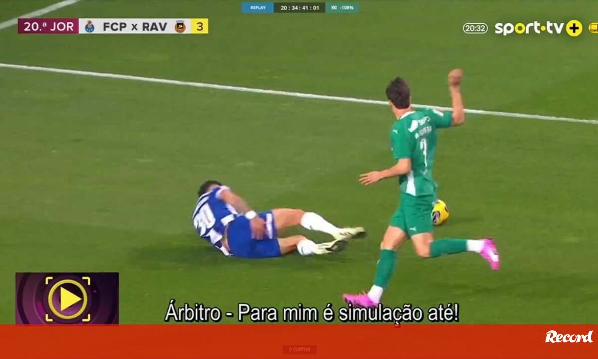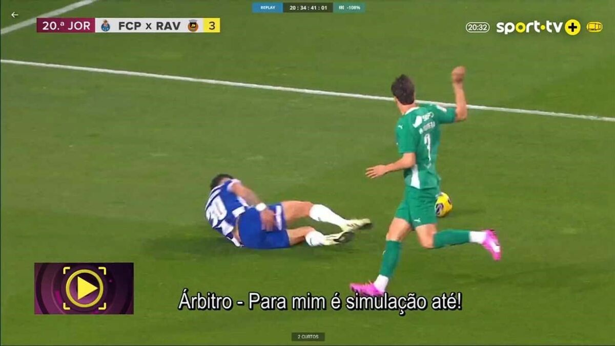 "Foi no início do jogo, o Rio Ave tinha a bola, transporta-a para a zona defensiva, o árbitro é apanhado de surpresa e fica afastado do lance. Houve trabalho de equipa. O assistente considerou que o defesa só quis jogar a bola. Ele não joga a bola, é importante dizer isso também. O árbitro com esta informação, de perceber que o defesa não jogou a bola e perante a queda e a distância a que estava, entendeu assinalar penálti. Vamos à análise do VAR. Antes de explicar o que é suportável ou não. O nosso entendimento e orientações para os árbitros é que no penálti tem de existir uma ação do defensor que cause efeito no atacante. Os pequenos contactos fazem parte do futebol. Se calhar no meio campo marcam falta, mas não queremos pseudo ou micro-penáltis. Porque o penálti é uma coisa evidente, pois estamos a falar de uma decisão crucial do jogo, que por norma dá golo e que tem impacto. No VAR, ao ver a imagem, ao ver o contacto, entende que não causa a queda, porque o atacante ia a arrastar o pé e para ele não é suficente para causar a queda, pois o jogador ia cair de qualquer forma. E foi isso que o levou a chamar o árbitro. E o árbitro utilizou a mesma leitura: ele já ia a arrastar, há contacto e não é suficiente e vamos cancelar. A pergunta que se faz é: este penálti é suportável ou não? Na nossa opinião, não. Há outra imagem que mostra o contacto, mas a pergunta é: este contacto faz cair o atacante? Não. Nesse sentido, esta intervenção é correta e o árbitro fez bem. Depois a opção de dar ou não amarelo, o árbitro entende que é simulação e é perfeitamente aceitável. O penálti está bem cancelado.