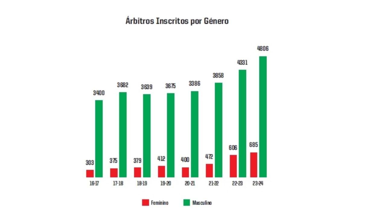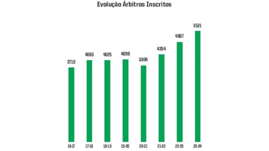 De 3.710 juízes inscritos na época 2016/17, a temporada 2024/25 registou 5.521, com destaque para a evolução por género. No feminino, o número de árbitras quase duplicou (de 303 para 685), sendo que o aumento também se verificou no masculino, de 3.400 para 4.806 juízes inscritos. Nas 8 temporadas em análise, apenas em 2020/21 se registou uma diminuição de árbitros face à época anterior (menos 294), período que foi afetado pela pandemia de Covid-19.
