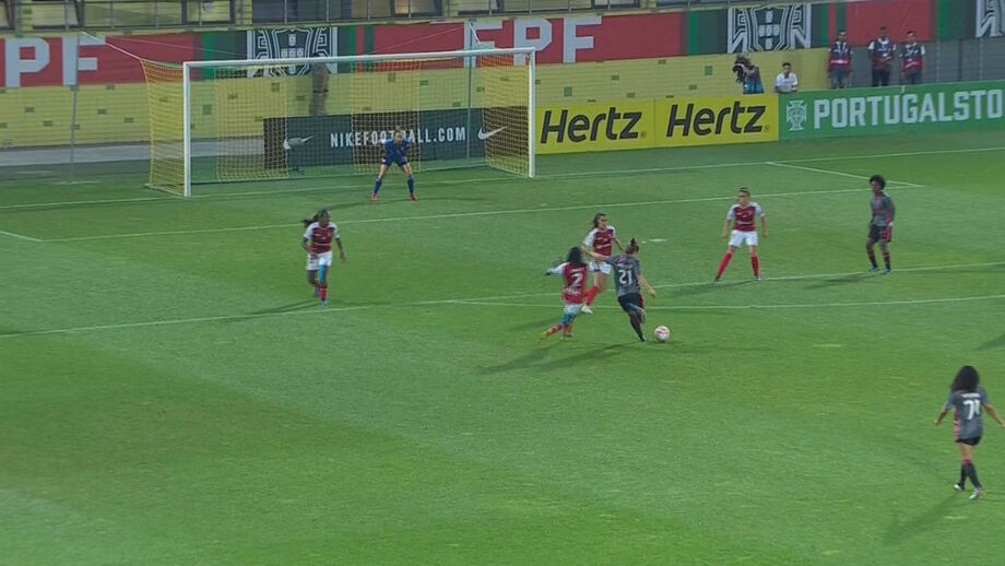 71'. Andreia Faria tentava rematar de longe, mas a bola foi bloqueada pela defensiva bracarense.