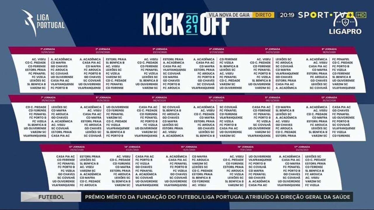 Este é o calendário completo da 2.ª Liga 2020/21, revelado esta segunda-feira no sorteio das competições profissionais.