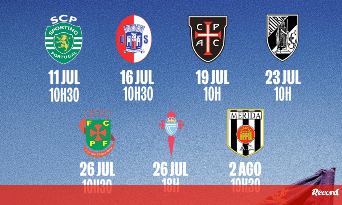Seguem-se encontros frente a U. Santarém (16 julho, 10h30), Casa Pia (19 julho, 10h00), Vitória de Guimarães (23 julho, 10h00), Paços de Ferreira (26 julho, 10h30), Celta de Vigo (26 julho, 18h00) e Mérida (2 agosto, 19h30).