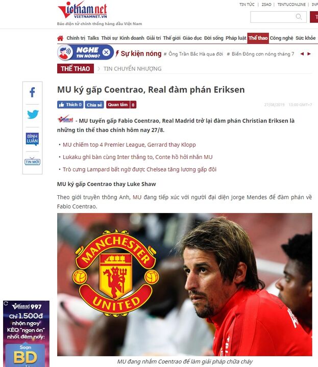Ainda no que diz respeito a Fábio Coentrão, por terras vietnamitas defende-se a tese de que o lateral português poderá ser colocado por Jorge Mendes no Manchester United para criar concorrência a Luke Shaw no corredor esquerdo da defesa. Uma tese pouco provável mas que está a ser veiculada pelo VietnamNet.