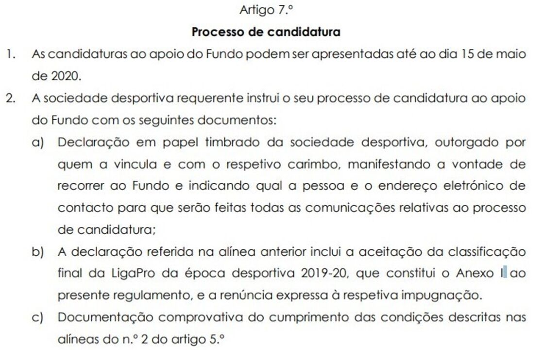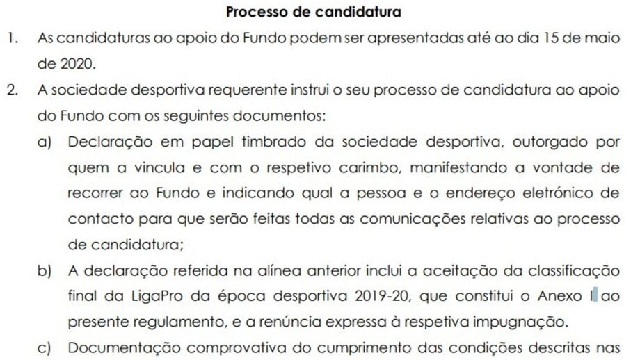 Segundo o regulamento que se encontra em preparação, os documentos de candidatura devem ser apresentados pelo clubes até dia 15 de maio e, após a referência a uma declaração em papel timbrado da sociedade desportiva manifestando vontade de recorrer ao fundo, surge então o controverso ponto b: