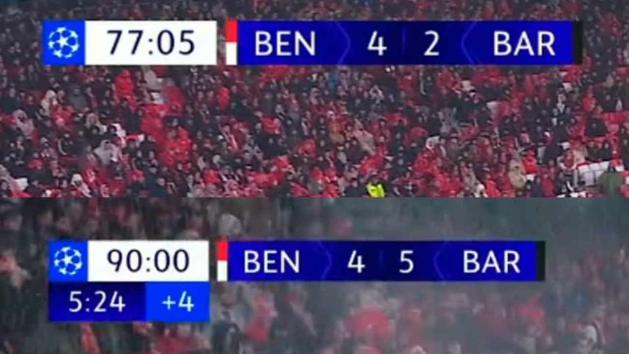 Momentos após o final da eletrizante partida no Estádio da Luz, o Barcelona recorreu às redes sociais para deixar uma espécie de provocação ao Benfica. Com uma simples montagem, os catalães mostraram como estava o marcador aos 78 minutos (altura em que o Benfica ainda vencia por 4-2) e depois o resultado final (4-5), já depois do golo de Raphinha, que confirmou a remontada épica dos catalães, aos 90'+6. A publicação foi acompanhada por um emoji a sorrir com a mão à frente da boca.