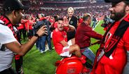 23h51 - Momento insólito na celebração ainda no relvado, com Gabriel a abrir uma garrafa de champanhe diretamente para o rosto de... Vlachodimos!