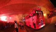 0h49 - O autocarro já está parado na zona reservada do Marquês de Pombal e os jogadores começam a descer para entrarem na passadeira vermelha preparada para os receber.
