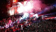 23h47 - O autocarro encarnado avança a ritmo lento, com milhares de adeptos nas ruas. Incrível o ambiente que se vai vivendo...