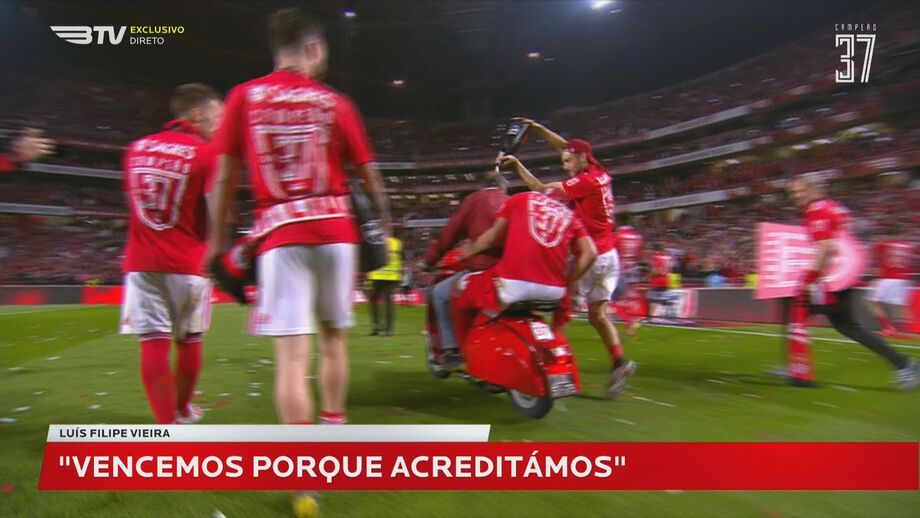 23h20 - Antigos jogadores das águias, João Cancelo, André Horta e Bernardo Silva deixaram mensagens em vídeo para felicitar o plantel. "Vocês merecem por tudo o que passaram esta época. Desfrutem e festejem muito", disse o lateral da Juventus, ao passo que Bernardo Silva lamentou estar longe de Lisboa. "Estou muito contente por vocês. Foi merecedíssimo. Infelizmente não posso estar aí convosco, mas festejem muito", disse o jogador do Manchester City.