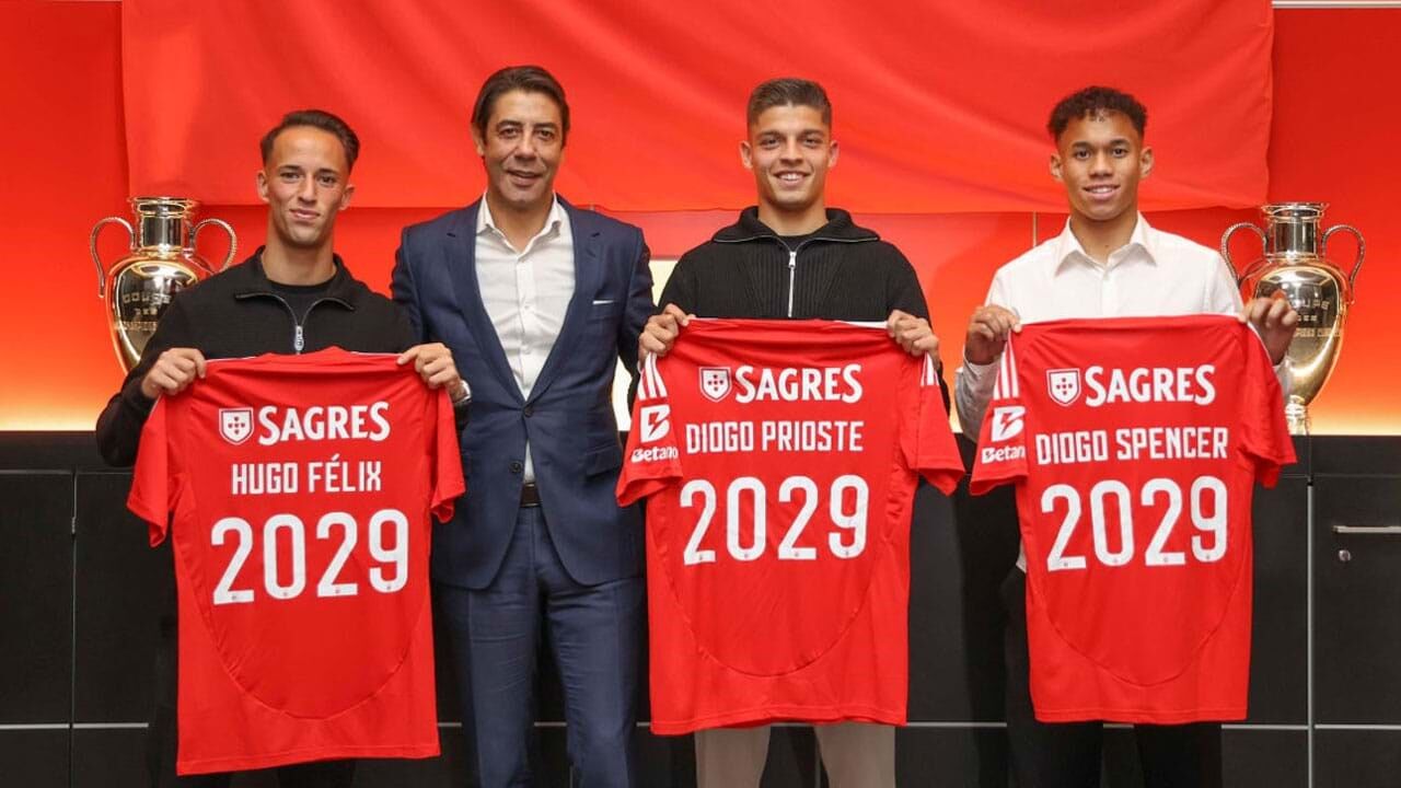 O lateral-direito Diogo Spencer, o médio Diogo Prioste e o médio-ofensivo Hugo Félix renovaram contrato com o Benfica até 2029. Os encarnados seguram assim três jovens promissores da formação, que oficializaram os novos vínculos na companhia do presidente, Rui Costa.