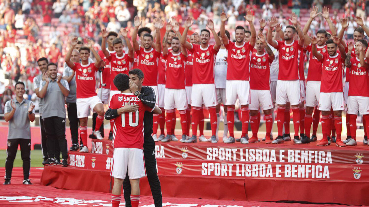 Numa altura em que todo o grupo já estava no palanque no centro do relvado, Bruno Lage quis ficar para trás à espera de Jonas, o último a subir ao relvado. E quando o internacional canarinho finalmente surgiu, o técnico benfiquista apressou-se a dar-lhe um forte abraço, dirigindo-lhe logo aí também algumas palavras ao ouvido. Foi mais um momento emocionante nesta despedida do goleador, que Lage acabou por ‘segurar’ já na última época. Tal como o nosso jornal adiantou, Jonas já queria ter terminado a carreira em janeiro, mas foi o treinador setubalense que o convenceu a continuar.