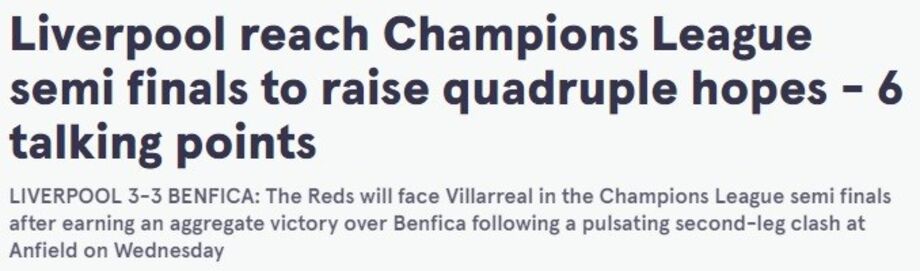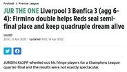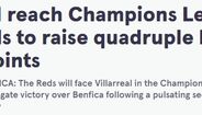 'Mirror': "Os reds vão defrontar o Villarreal na Liga dos Campeões depois de conquistarem uma vitória contra o Benfica numa segunda mão entusiasmante em Anfield".