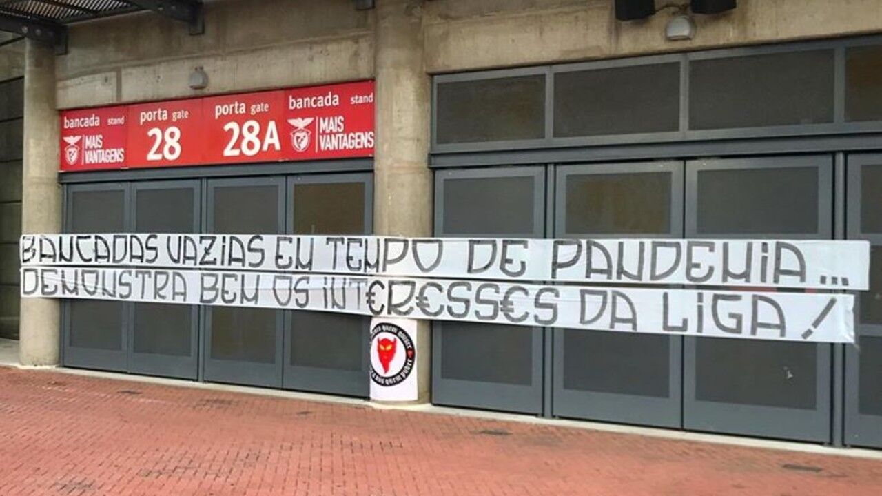 Os Diabos Vermelhos colocaram uma tarja junto à porta 28 do Estádio da Luz em que apontam o dedo ao organismo que gere o futebol português: "Bancadas vazias em tempo de pandemia... Demonstra bem os interesses da Liga!"