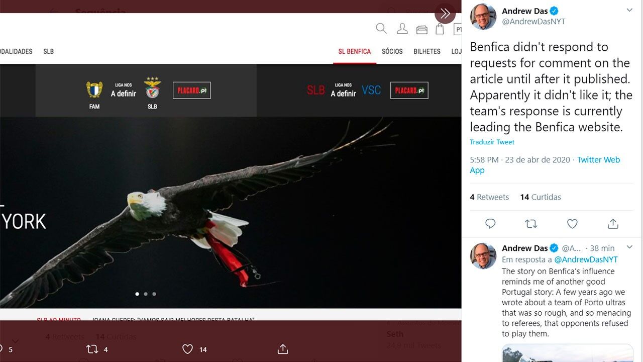 Andrew Das, editor adjunto do 'New York Times', utilizou esta quinta-feira a sua conta na rede social Twitter para reagir à postura adotada pelo Benfica na sequência da reportagem publicada na véspera. Num 'tweet' publicado ao final da tarde, Das refere que as águias apenas acederam ao pedido de resposta já depois de a peça ter sido colocada online e que aquela reação se terá devido ao facto de não terem gostado do que havia sido escrito.
