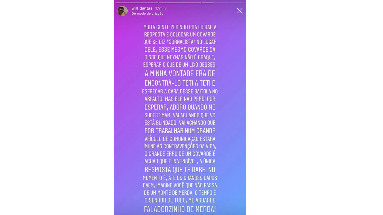 O agente de Pedrinho, futuro jogador do Benfica, foi alvo de duras críticas depois de nas redes sociais ter deixado ameaças a um jornalista - que não identificou. No entanto, Will Dantas deu a entender que seria André Rizek, apresentador do Sportv, que não se deixou ficar.