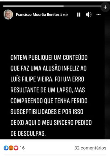 "Ontem publiquei um conteúdo que faz uma alusão infeliz a Luís Filipe Vieira. Foi um erro resultante de um lapso, mas compreendo que tenha ferido susceptibilidades e, por isso, deixo aqui o meu sincero pedido de desculpas", escreveu Benitez no Instagram, a rede social onde havia efetuado a anterior publicação polémica.