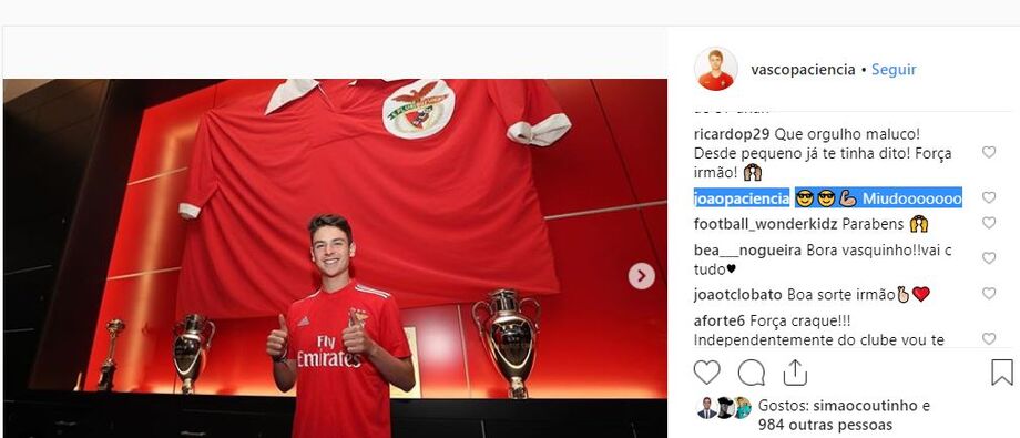 O Benfica anunciou esta quinta-feira a contratação de Vasco Paciência, um dos três filhos de Domingos Paciência, e a família do avançado de 18 anos aproveitou as redes sociais para publicamente comentar a assinatura de contrato até 2023.