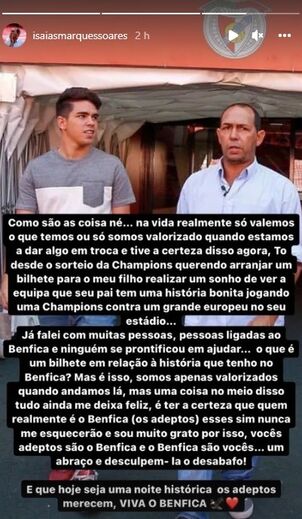 Entretanto, o antigo jogador apagou a publicação das redes sociais. Fonte do Benfica garantiu a Record que Isaías já tem bilhetes para o encontro da Champions, tendo sido estes entregues ao seu filho.