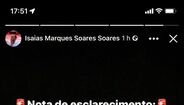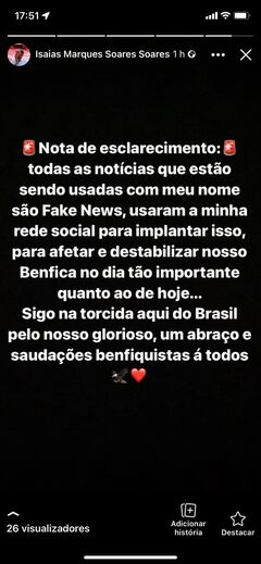 "Nota de esclarecimento: todas as notícias que estão a ser usadas com o meu nome são Fake News. Usaram a minha rede social para implantar isto, para afetar e desestabilizar o nosso Benfica num dia tão importante quanto o de hoje. Sigo a 'torcida' aqui do Brasil pelo nosso glorioso. Um abraço e saudações benfiquistas a todos", escreveu, através das 'stories' do Instagram.