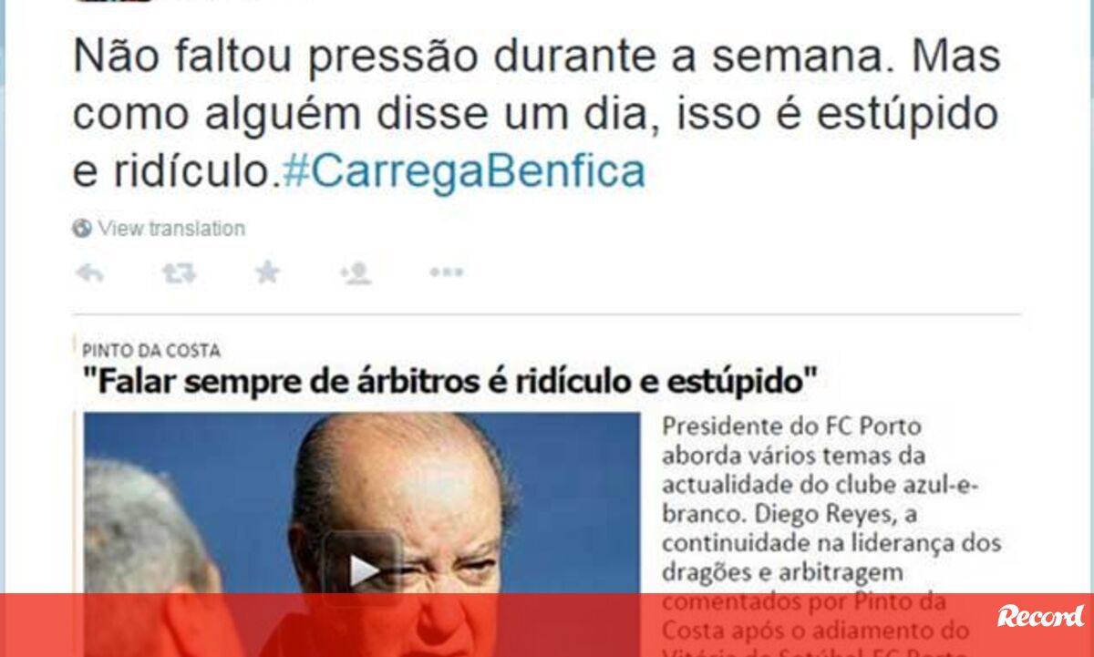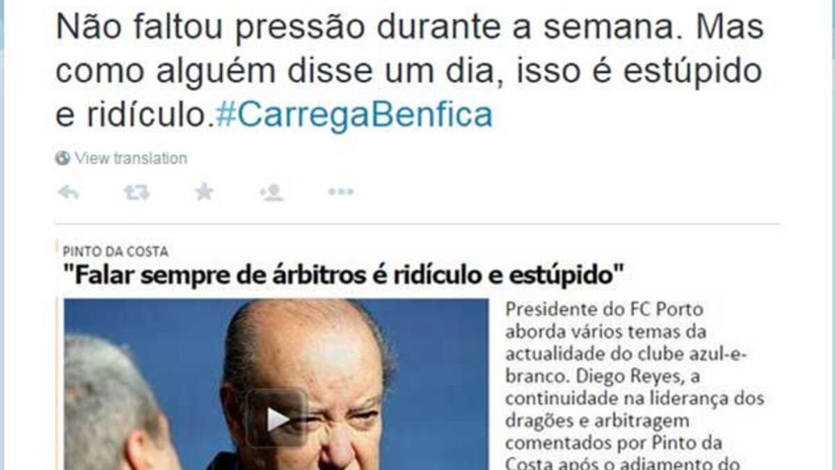 "Não faltou pressão durante a semana. Mas como alguém disse um dia, isso é estúpido e ridículo. #CarregaBenfica", escreveu o diretor de comunicação do Benfica, a propósito de Pinto da Costa e das críticas do FC Porto à nomeação de João Capela.