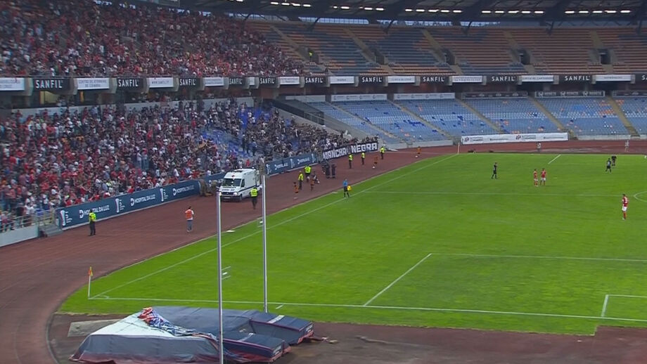 Uma enorme confusão instalou-se numa das bancadas do Estádio Cidade de Coimbra e o árbitro teve mesmo de parar o jogo. Pelo menos um adepto terá ficado ferido e teve mesmo de ser retirado de ambulância. Alguns adeptos, incluindo crianças, chegaram a entrar na pista de atletismo para fugir aos desacatos, que obrigaram à intervenção da polícia.