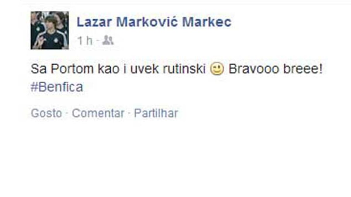 "Pessoal, desejo que regressem rapidamente a Lisboa porque no Porto está frio (-6)", escreveu, em clara referência à desvantagem pontual que o FC Porto tem para o Benfica no campeonato, após a vitória de hoje no Estádio do Dragão. Pouco antes, Markovic havia lembrado que o Benfica "ganhou ao FC Porto como de costume".