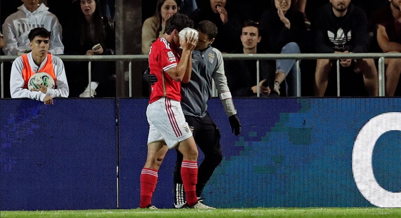 João Neves abandonou as quatro linhas do São Luís muito queixoso, com um hematoma no olho direito e gelo no rosto. O jovem jogador, de 19 anos, vai ser reavaliado hoje, no Benfica Campus.