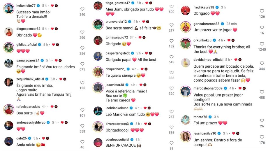 Em quase todos os comentários que surgem na publicação de João Mário na sua página oficial no Instagram as expressões "obrigado" e "foi um prazer" estão presentes e dão contam do enorme respeito, admiração e carinho que alguns dos ex-colegas de João Mário têm pelo ex-internacional português que hoje foi anunciado no clube de Istambul, ao lado de Rafa Silva e Gedson Fernandes, outros dois antigos jogadores do Benfica.