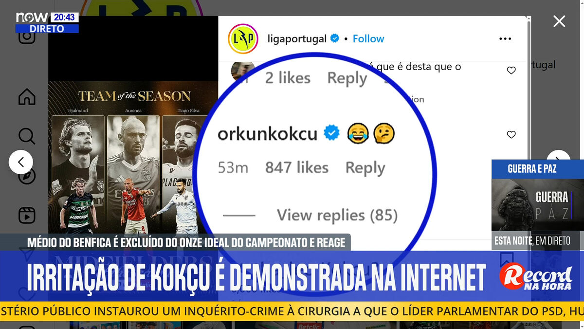 O médio Kökçü reagiu de forma irónica através de dois emojis (um a rir e outro pensativo) à divulgação dos três melhores médios da Liga 2024/25, lote em que não entrou. As escolhas recaíram no colega de equipa Aursnes, Hjulmand (Sporting) e Tiago Silva (V. Guimarães). A reação do internacional turco, que se encontra nos Estados Unidos ao serviço da seleção tendo em vista os jogos com os EUA e o México, gerou rapidamente mais de mil gostos.