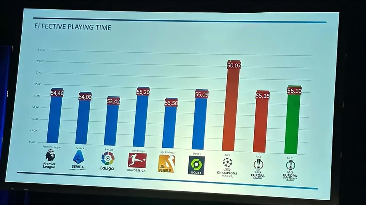 No topo da lista do tempo útil de jogo está a Bundesliga, com 55.2%, ao passo que a Ligue 1 conta com 55.09%, a Premier League com 54.46% e a Serie A com 54%. A maior percentagem de tempo útil é, contudo, nas competições sob a égide da UEFA: a Liga dos Campeões conta com 60.07%, a Conference League 56.10% e a Liga Europa 55.15%.