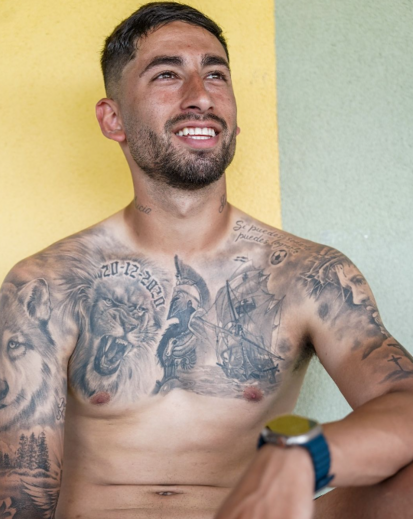 No peito há espaço para um leão, um guerreiro ao estilo de gladiador e para um barco conquistador, sendo que no braço direito é possível ver um lobo tatuado. Portanto, a associação é simples de fazer, com as referência aos símbolos de Sporting, Sp. Braga, V. Guimarães e Arouca.