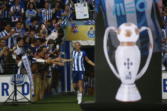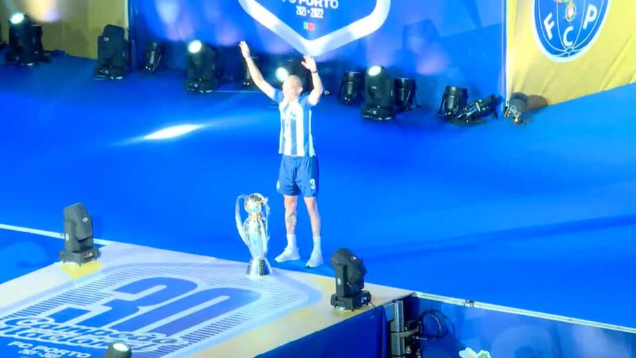 Através de um palco, os jogadores portistas surgem agora perante os adeptos um a um. Pepe é o primeiro e traz a taça.