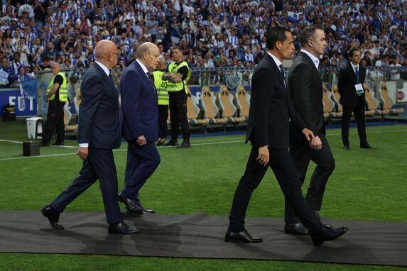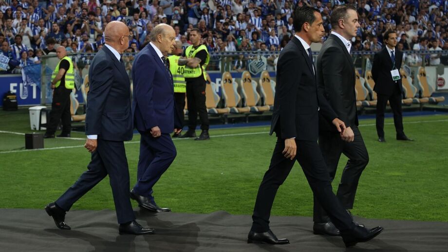 Helton, embaixador da Liga Portugal e ex-capitão do FC Porto, traz o troféu da Liga Bwin para o centro do relvado. Em breve, os jogadores portistas serão chamados um a um. Pinto da Costa também já está no relvado.
