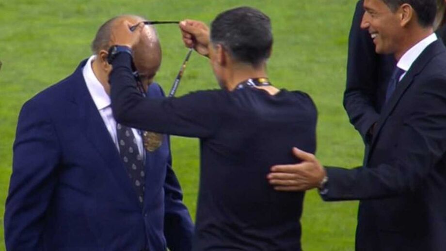 Os jogadores portistas vão sendo chamados para receber as medalhas de campeão.