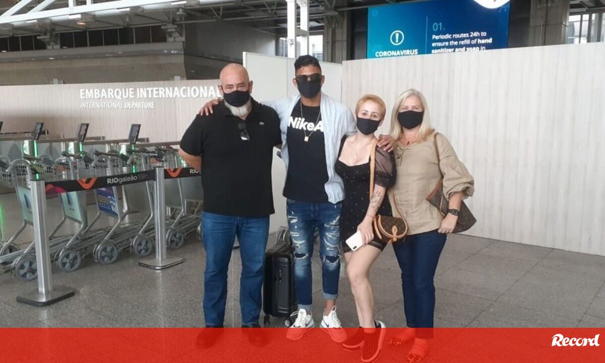 Acompanhado pelos pais e pela esposa, Evanilson surge de máscara e de óculos pretos e aparentemente bem disposto, posando até para a câmara.