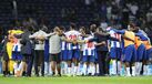 - Os jogadores de campo do FC Porto juntam-se aos guarda-redes azuis e brancos nos exercícios de aquecimento, motivando um enorme aplauso do Estádio do Dragão. A equipa do Krasnodar também já está no relvado.