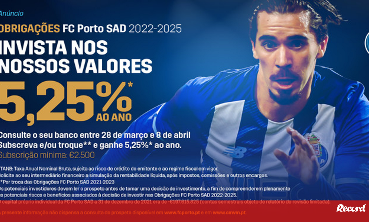 "A Futebol Clube do Porto – Futebol, SAD ("FC Porto SAD") está a proceder à oferta pública e de admissão à negociação de obrigações, denominadas Obrigações FC Porto SAD 2022-2025, com valor nominal unitário de €5 e taxa de juro fixa de 5,25%* ao ano (TANB: Taxa Anual Nominal Bruta), no montante global inicial de até €40.000.000, o qual poderá ser aumentado por opção da FC Porto SAD até ao dia 5 de abril de 2022, inclusive através do lançamento de uma oferta pública de subscrição em dinheiro ("Oferta de Subscrição") dirigida ao público em geral e de uma oferta pública de subscrição mediante entrega de Obrigações FC Porto SAD 2021-2023 ("Oferta de Troca" e em conjunto com a Oferta de Subscrição, "Ofertas"), dirigida a titulares de Obrigações FC Porto SAD 2021-2023", pode ler-se no comunicado publicado no site oficial.