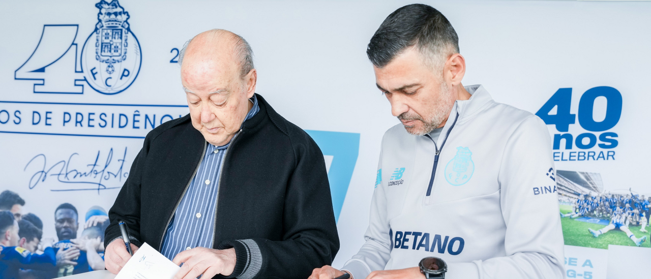 A oficialização da renovação de Sérgio Conceição até 2028 surgiu esta quinta-feira, com o FC Porto a ter divulgado imagens, através dos seus canais de comunicação, do momento em que o treinador e o presidente Pinto da Costa rubricaram os documentos.