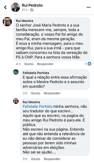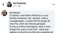 "O senhor José Maria Pedroto e a sua família merecem-me, sempre, toda a consideração. o vosso Pai foi amigo do meu Pai, eram da mesma geração. É essa a minha mensagem, para o meu amigo Rui, para a sua irmã - para que saibam concorreu na lista da vereação do PS à CMP e para a senhora vossa Mãe", escreveu o autarca, recebendo depois uma reação por parte de Rui Pedroto: "Rui Moreira, muito obrigado. De si só esperava esta amável reação."