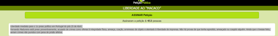 A claque, que promove a iniciativa nas suas redes sociais, intitula a iniciativa como "Liberdade ao Macaco". "Liberdade imediata para o primeiro preso político em Portugal do pós 25 de Abril. Fernando Madureira está preso preventivamente, acusado de crimes como ofensa à integridade física, ameaça, coação, arremesso de objeto e atentado à liberdade de imprensa. Não há provas de que tenha agredido, ameaçado ou coagido alguém. Ainda que o tivesse feito, seriam crimes não punidos com pena de prisão afetiva", pode ler-se na petição que se encontra online e que já foi assinada por mais de 1.400 pessoas.