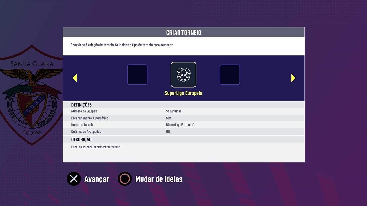 "Quando estás a jogar FIFA e lembras-te de criar um torneio só com alguns dos teus amigos", pode ler-se na publicação do Santa Clara, que apresenta uma imagem detalhada do processo de criação da prova , saltando à vista as possibilidades de 'Avançar' ou 'Mudar de Ideias'.