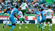 38' - Coates e Guedes chocam de cabeça. O internacional português a sair algo combalido do relvado.