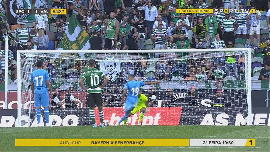 Empata o Valência! Ao minuto 9 e na sequência de um canto, o francês Kondogbia salta mais alto do que a defesa do Sporting e repõe a igualdade.