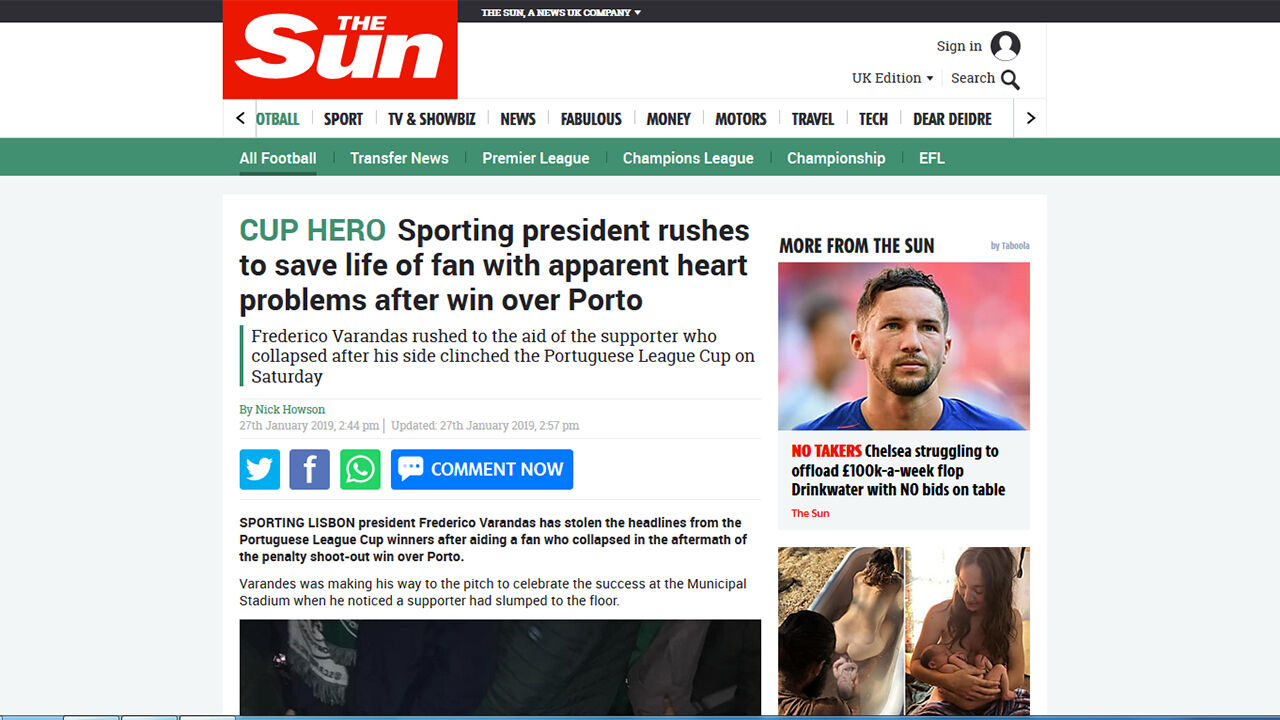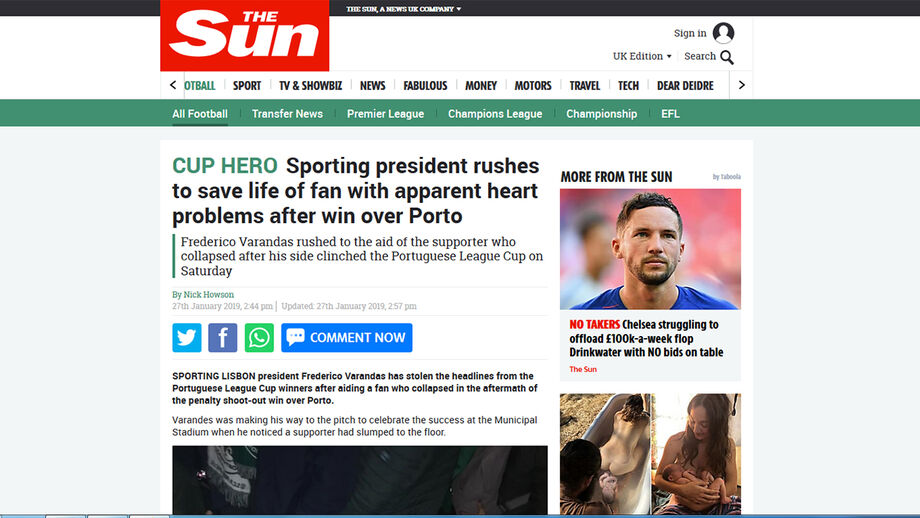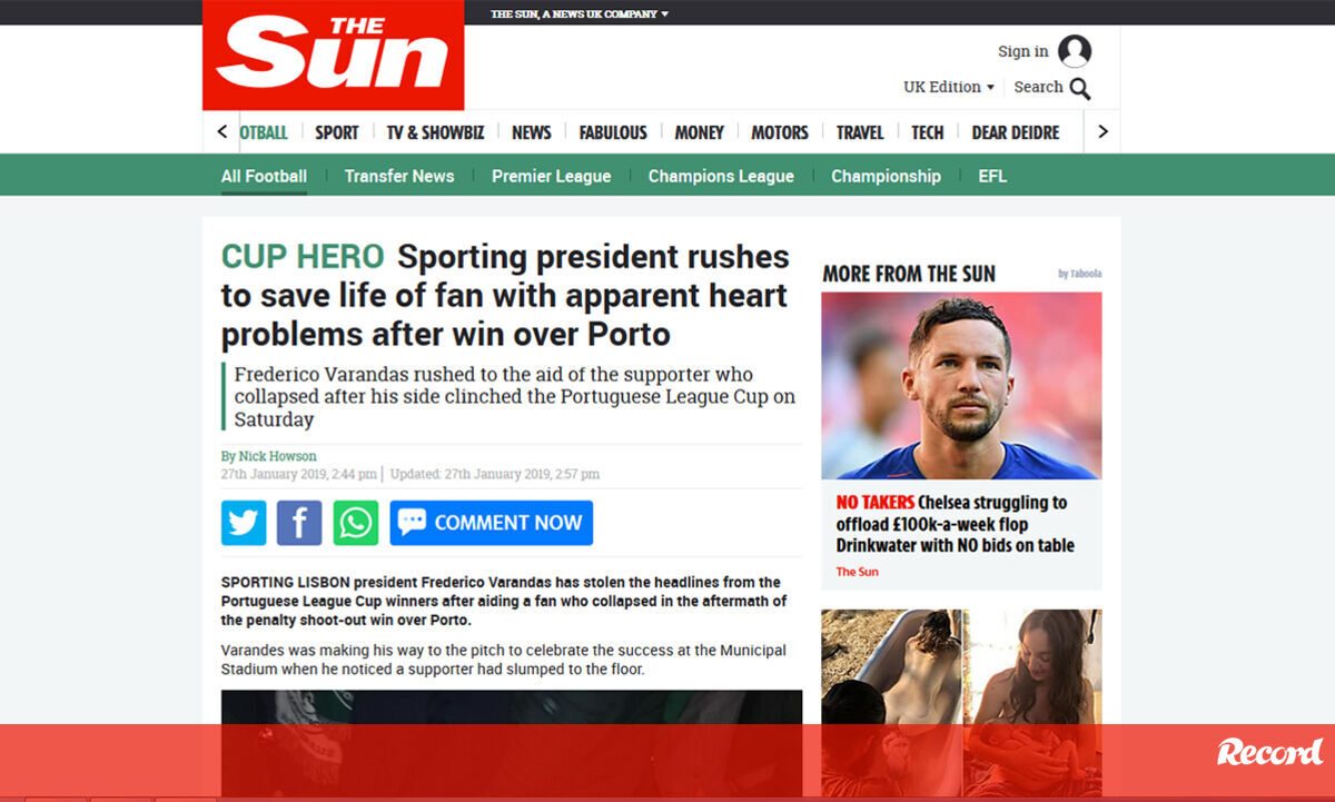 'The Sun' dedica página ao ato "heróico" do presidente do Sporting