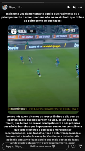 Filipa Gonçalves, namorada de Eduardo Quaresma, reagiu no Instagram à exibição do jogador do Sporting frente ao FC Porto (2-0), através da partilha de um vídeo da Sport TV que destaca os melhores momentos do jovem central no clássico de segunda-feira.