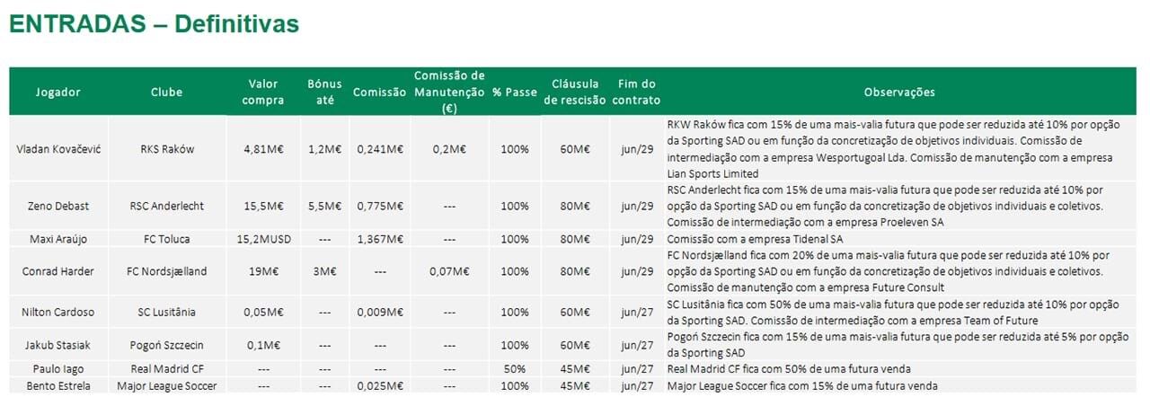 No que respeita às entradas, a SAD presidida por Frederico Varandas confirma o custo dos quatro nomes que reforçaram a equipa principal: Kovacevic (ex-Raków), por 4,8 M€, mais bónus de 1,2 M€; Debast (ex-Anderlecht), por 15,5 M€, mais bónus de 5,5 M€; Maxi Araújo, por 15,2 M$ (cerca de 14,3 M€); e Conrad Harder (ex-Nordsjaelland), por 19 M€, mais bónus de 3 M€.