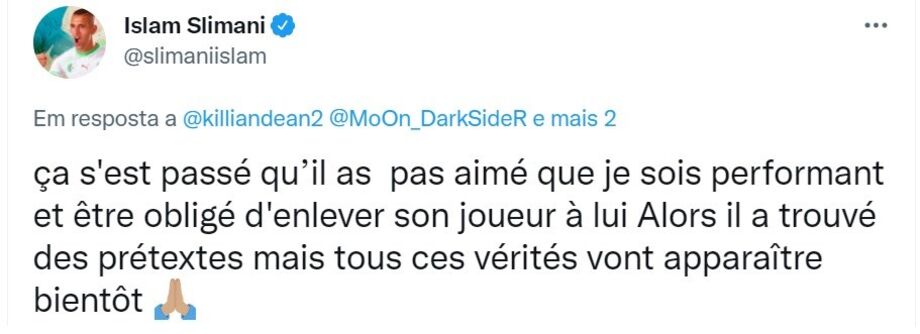 Um dia depois de ter sido anunciado como reforço do Brest, e de já ter prestado declarações ao seu novo clube, Islam Slimani abordou pela primeira vez a saída do Sporting. Fê-lo na rede social Twitter, em resposta a uma sequência de comentários sobre a sua saída e o facto de Rúben Amorim não ter apostado no argelino.