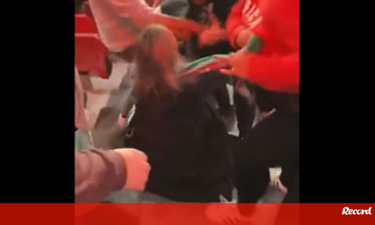 Nas imagens, é possível ver um adepto dos encarnados a arrancar um cachecol do Sporting do pescoço de uma adepta dos leões ao que se seguem alguns empurrões.